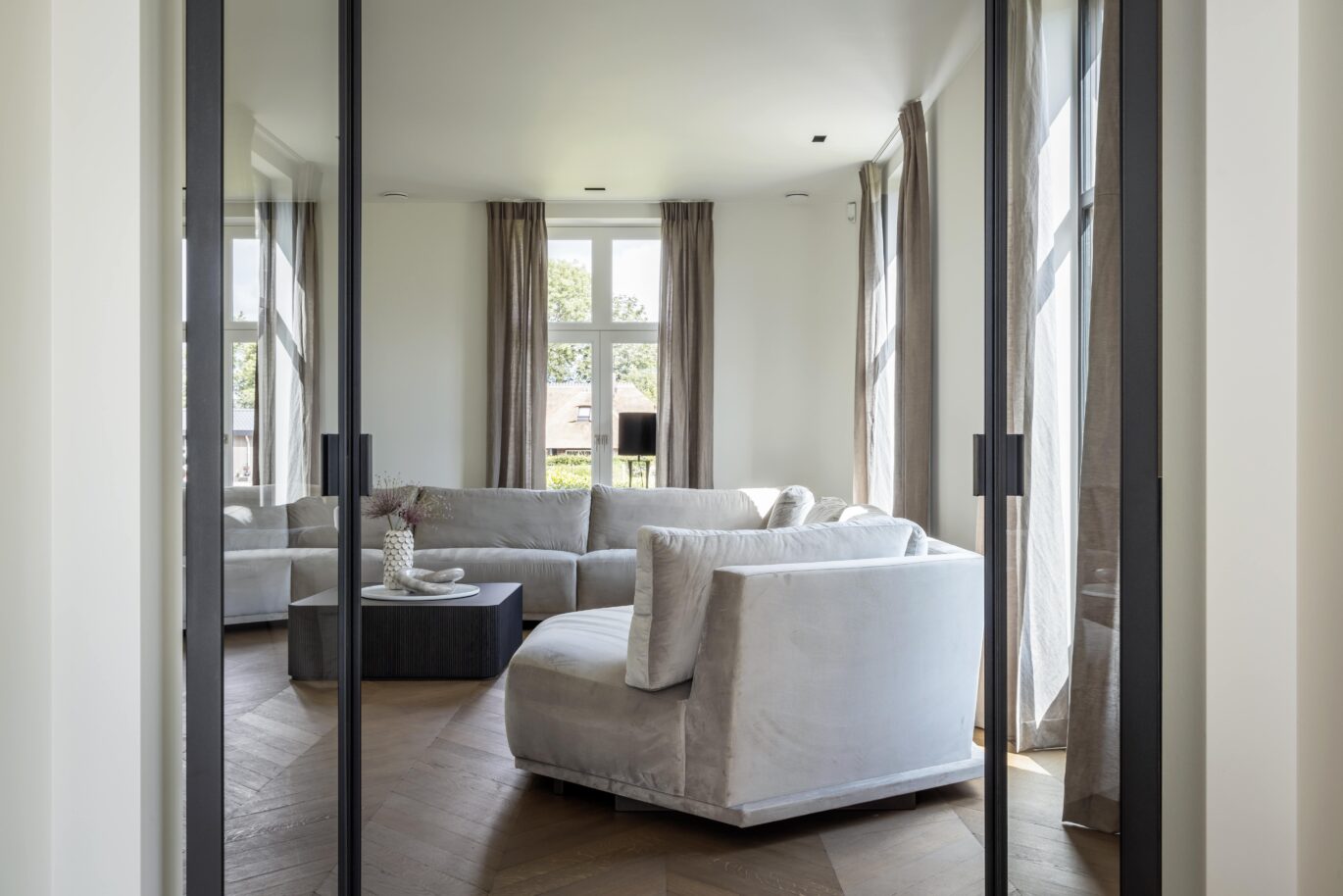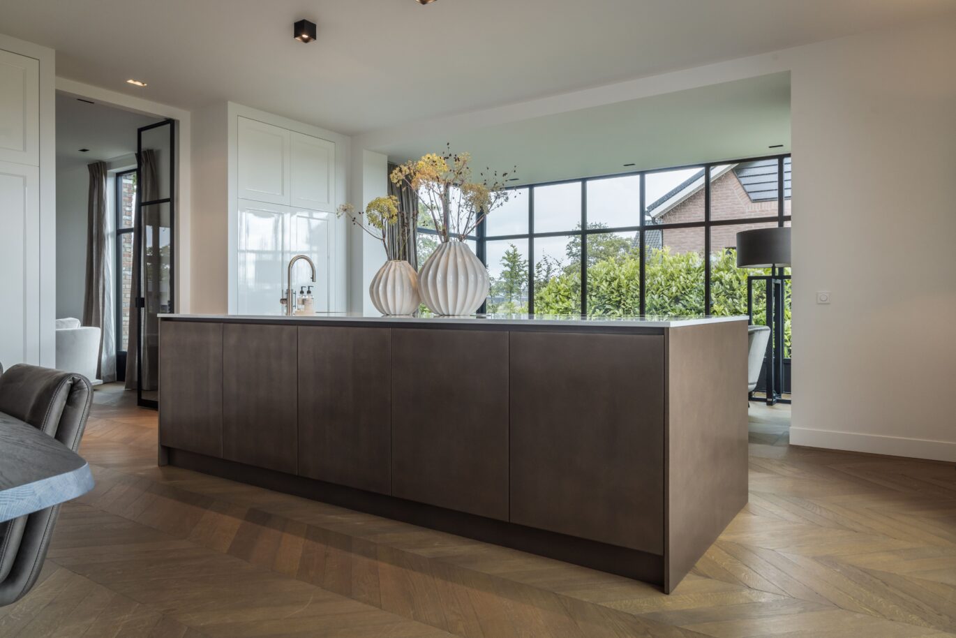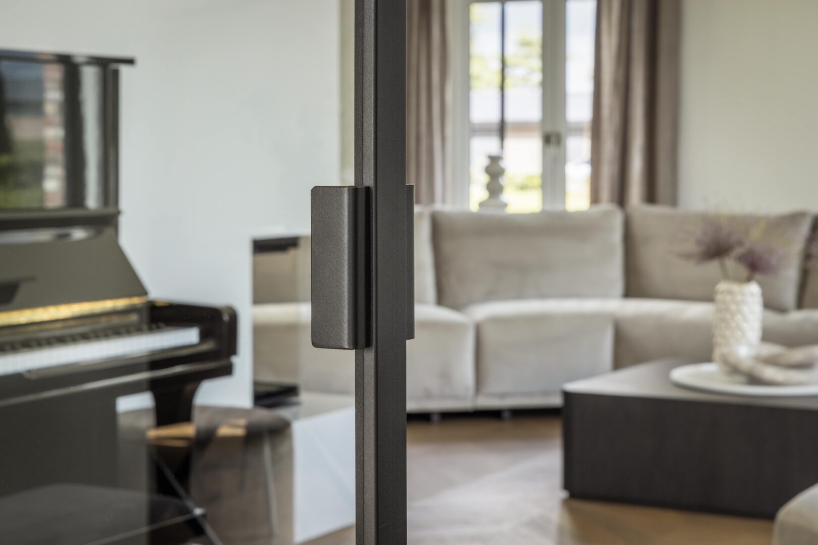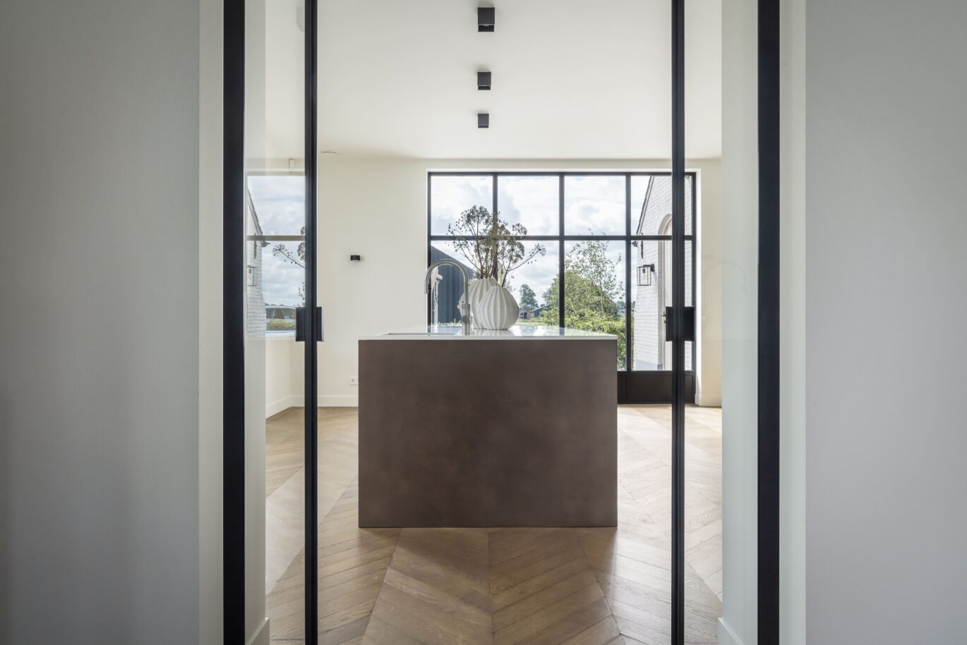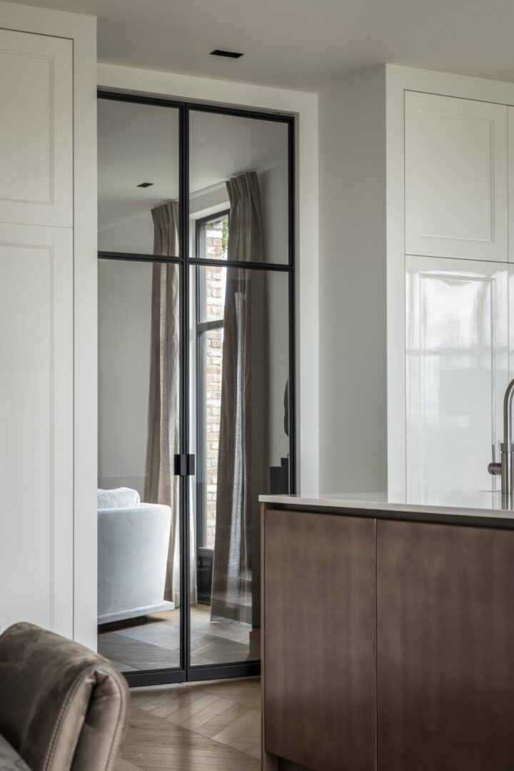 Zwarte stalen deuren met glas van keuken naar woonkamer