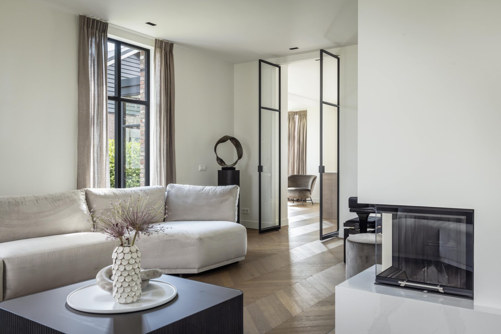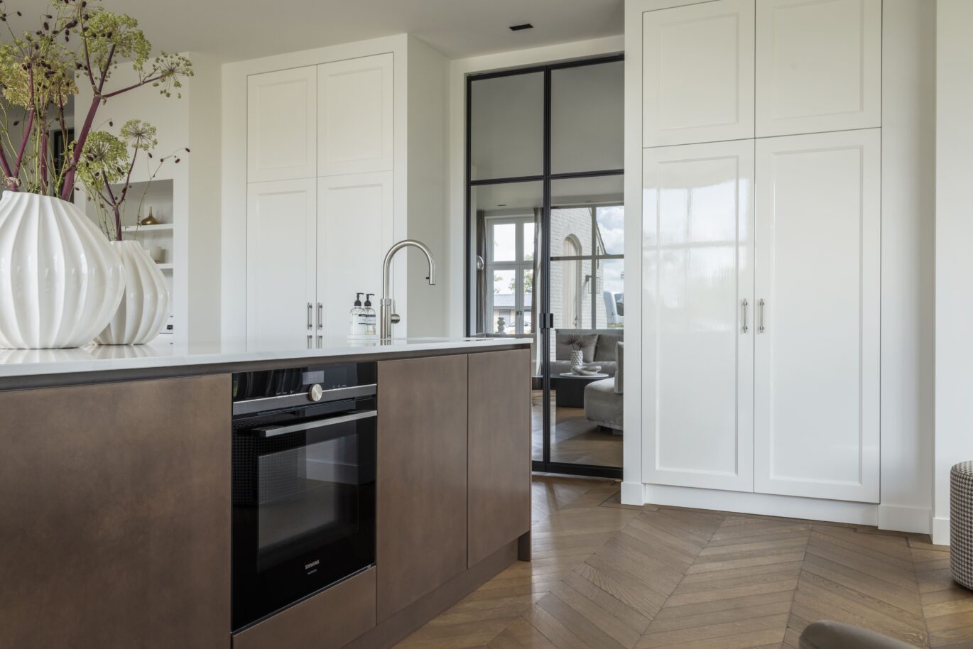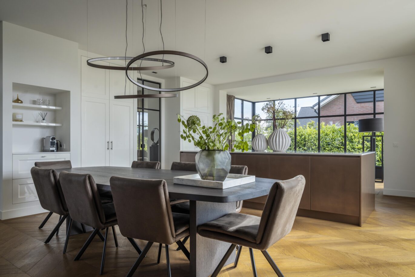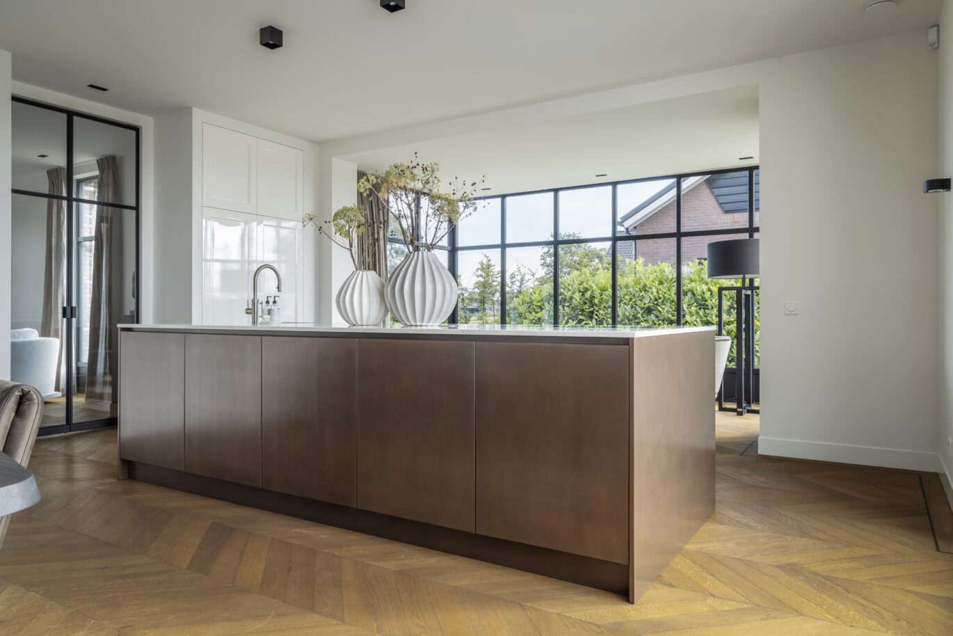 Zwarte stalen deuren met glas van keuken naar woonkamer